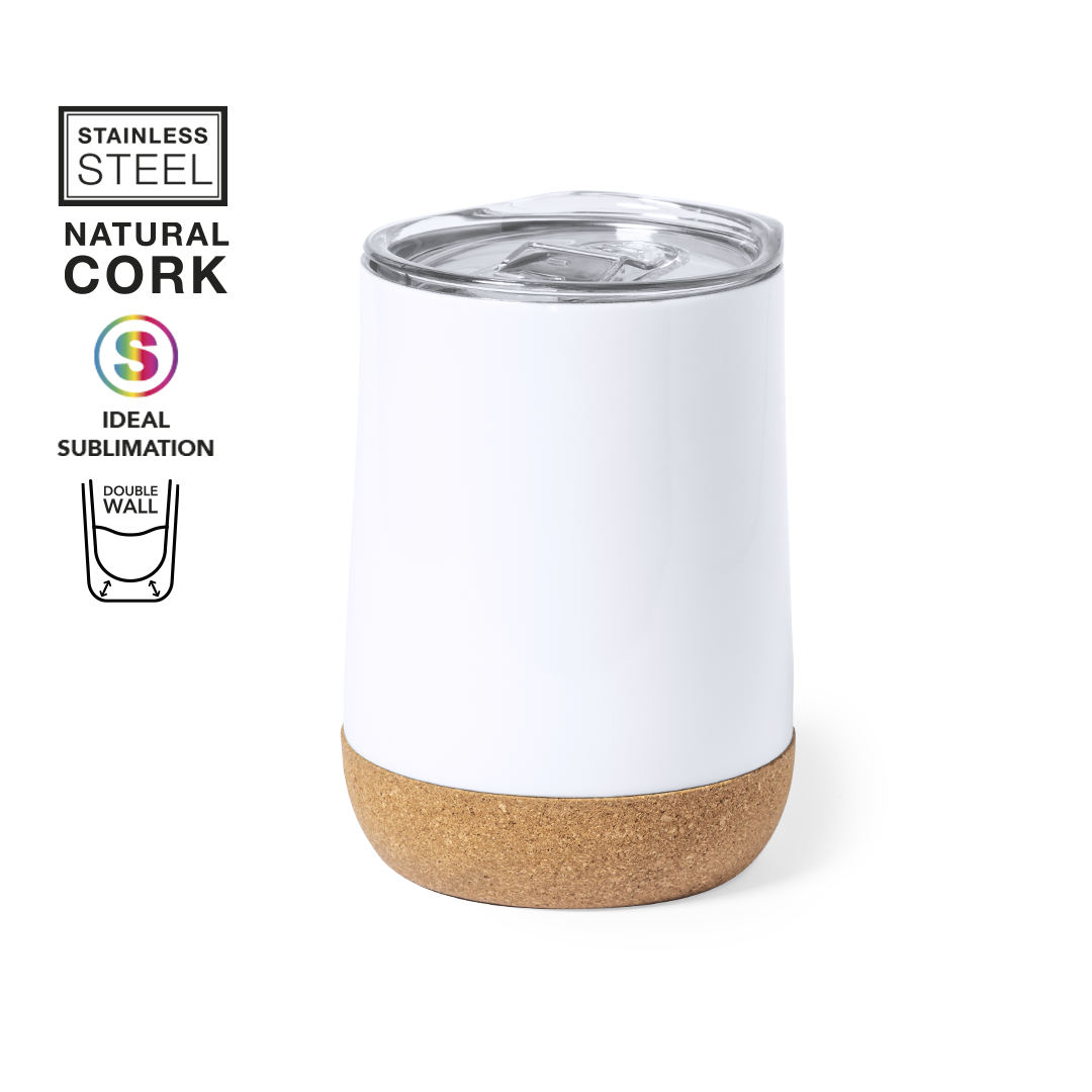 Vaso térmico de acero inox de doble pared y 330ml de capacidad. Especialmente diseñado para marcaje en sublimación, acabado en blanco brillo. Con dosificador en tapa, libre de BPA, y base en corcho natural. Presentado en caja individual de diseño kraft.
